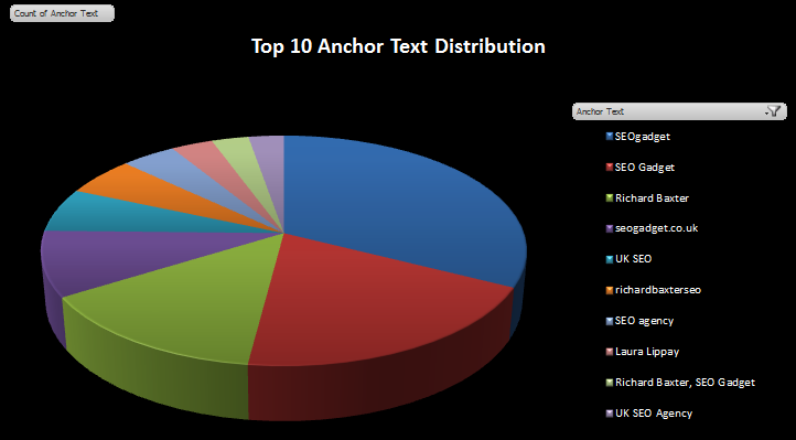 Not to mention you've got no idea how many links each anchor text has since the pie chart only shows each anchor text’s share in proportion to the whole (don’t even think about adding data labels on long sticks to your pie chart to get around this shortfall).