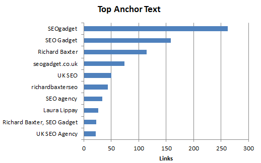 Compare this to the bar chart which gives you an instant visualization of which anchor text has the most links and how many, and how they fare in comparison to the other anchor text.