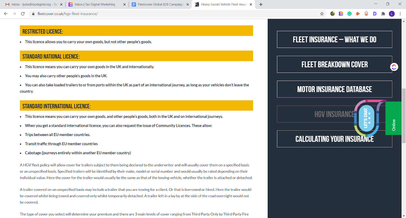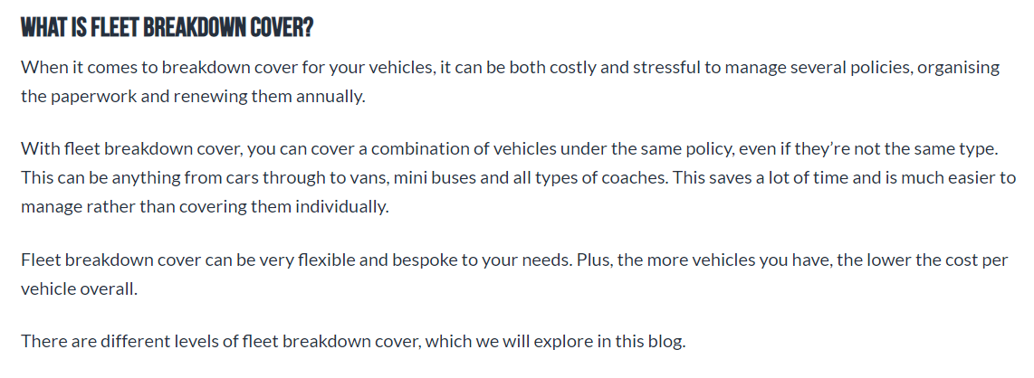 In addition, utilizing a simple but effective tone of voice helped to meet the needs of potential consumers and give them the information they need in a straightforward way. When focusing on keywords/phrases that contain industry jargon, we always include information about what the word or phrase means for those with informational intent about a particular topic, for example ‘fleet breakdown cover’.