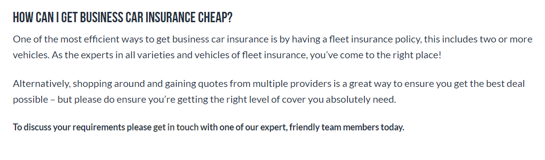 Including clear, natural CTAs at the end of each piece was really important, not only to round out the articles, but also to encourage readers to use Fleetcover’s broker service. See an example from our piece about business car insurance below.