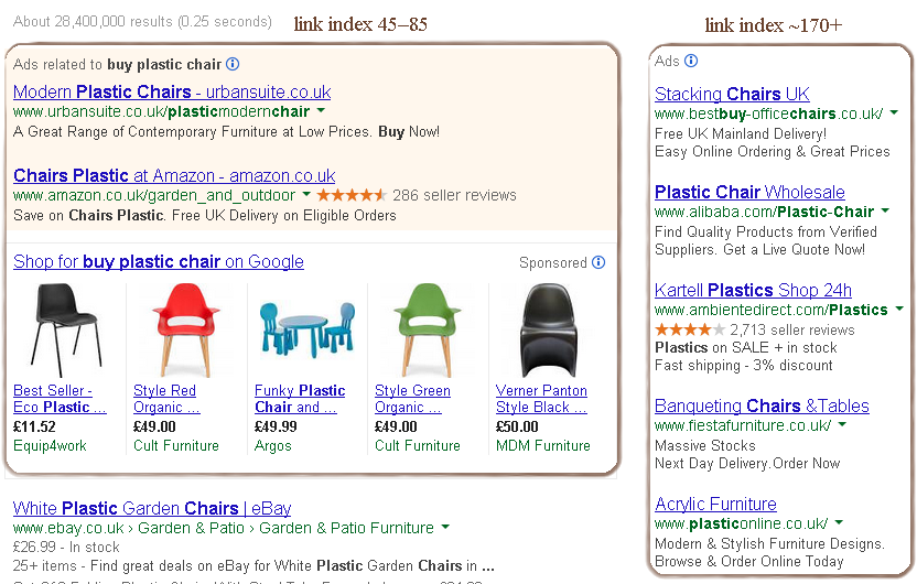 - If it's about 45—65 or less (shopping results could go up to 85), then it means the adword was in the main column above the organic results