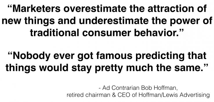 Marketing does not really change that much because people do not change—and anyone who says differently is selling something. Countless gurus, writers, and keynote speakers have proclaimed that "inbound marketing is the future," "social media has changed everything (a parody of TED talks)," and "advertising is dead."