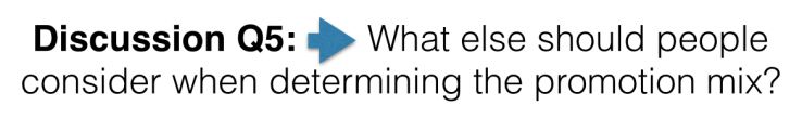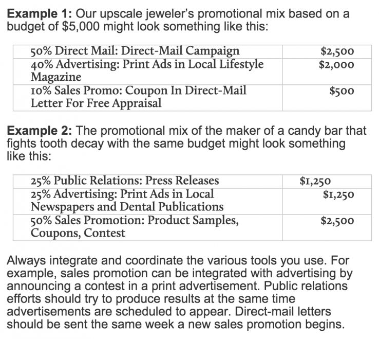 Companies will generally allocate different weights to each part of the promotion mix based on how they answer these types of questions. Here is an example from the Edward Lowe Foundation, a US non-profit organization that helps to encourage local entrepreneurship: