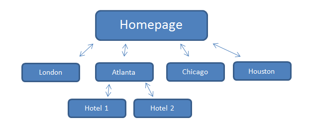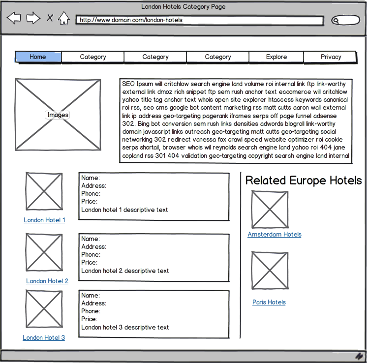 Then, pattern match the continents, then countries, then cities. If we do this, then your London hotels page could like this way, with links in the sidebar to Paris, Munich, Amsterdam, etc and not links to Orlando and Atlanta -