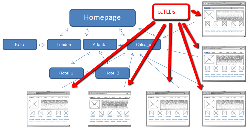 A tip that I gave in the video is to link between your relevant pages on your ccTLDs (.co.uk, .fr, etc) to the relevant page on the other TLDs. Using this methodology, we end up with the following structure and linking patterns instead of the craziness seen above: