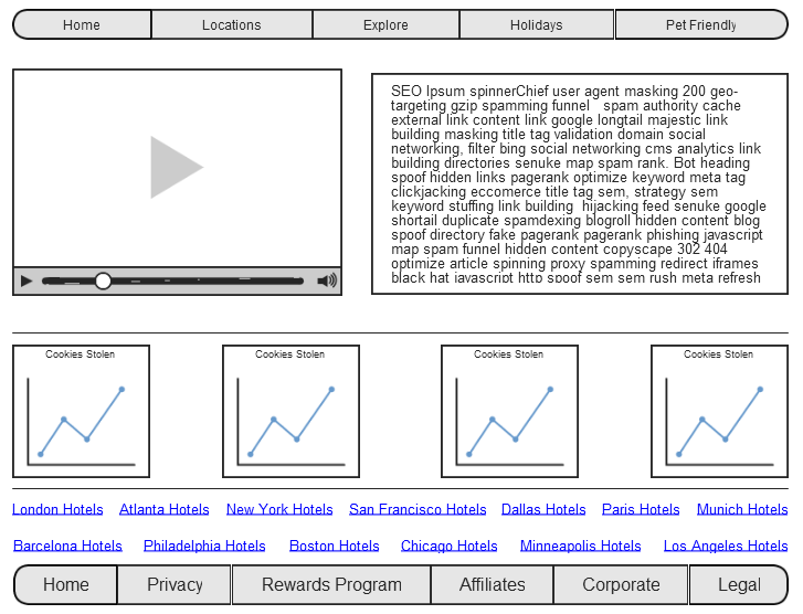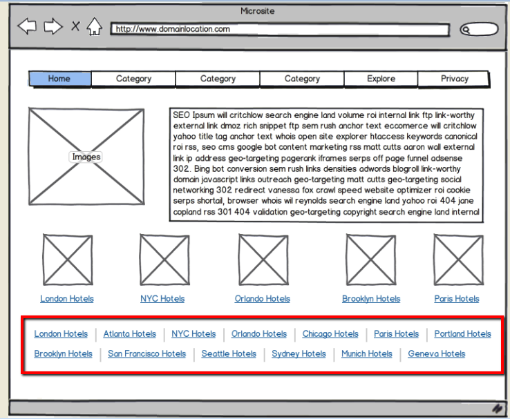 But if you scale this out to a sitewide section, such as in the hotels site above, then every page becomes like a homepage linking with optimized anchor text. And often these links are irrelevant and don't add value to the user.