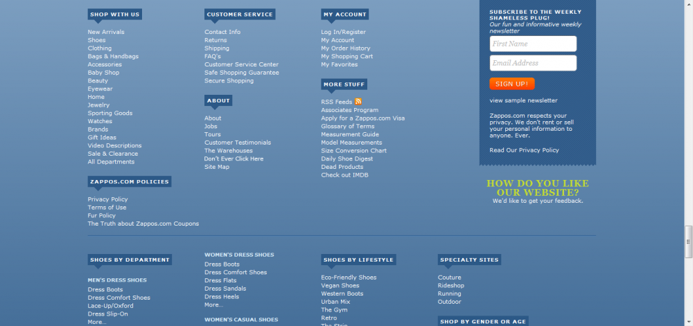 Zappos does this as well, though interestingly they do not have the same footer on the homepage as they do on their category pages (take a look at the homepage and this category to see the difference). They are not overloading you with anchor text and taking you to irrelevant pages from every page, though. Their main footer is large, yes, but contains useful links for the user.