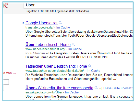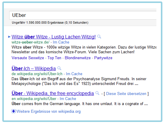 If you look at the URLs, you'll notice that Google highlights über when I searched for Ueber (but not the other way around). Let me just emphasize that this actually works differently In my wonderful Danish, Both Google and Bing will highlight Æ as AE and visa versa, it seems that's not the case in German.) Bing screenshots below.