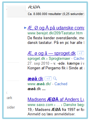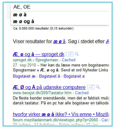 What is interesting is that if we do the same search but use ÆØÅ instead of AEOEAA then the exact match domain name will rank higher (spot 3 instead of 4) and when you type AEOEAA Google Suggest will even suggest ÆØÅ.