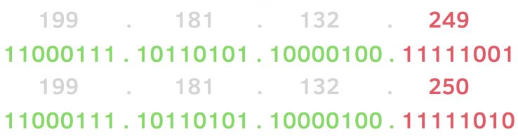 Now CIDR notation is more refined and more accurate than the concept of C-Block; in the example above the two IP addresses are not just in the same C-Block they are even more closely related as 6 bits in the last block are also identical. In CIDR notation we could say both these IP addresses are in the 199.181.132/30 block to indicate that the 30 leading bits are identical.