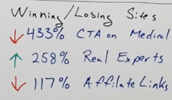 For example, for medical queries, sites that lost had 433% more CTAs, calls to action, typically because they're selling something, they're trying to sign you up, a little bit of mixed intent. Where the expert sites had fewer CTAs. The winning sites were written 258% more by real experts as opposed to laypeople or people without advanced degrees.