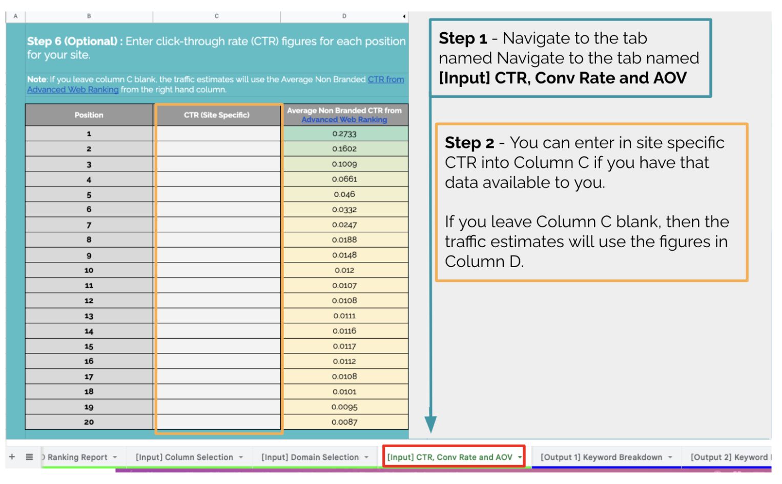 Note: If you leave this column blank, traffic estimates will use the Average Non Branded CTR from Advanced Web Rankings.