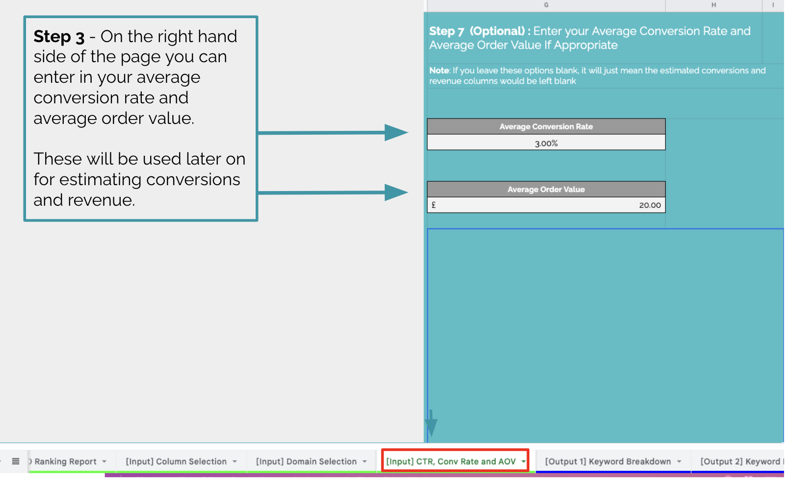 The estimated traffic, conversions, and revenue positions take the inputs from the [Input] CTR, Conv Rate and AOV tab.In the example below, we are working out the estimated traffic by multiplying the highest potential rank (in column C), looking up the CTR for that position and then multiplying it by the Search Volume (in column B). The same logic applies to the conversions and revenue figures.