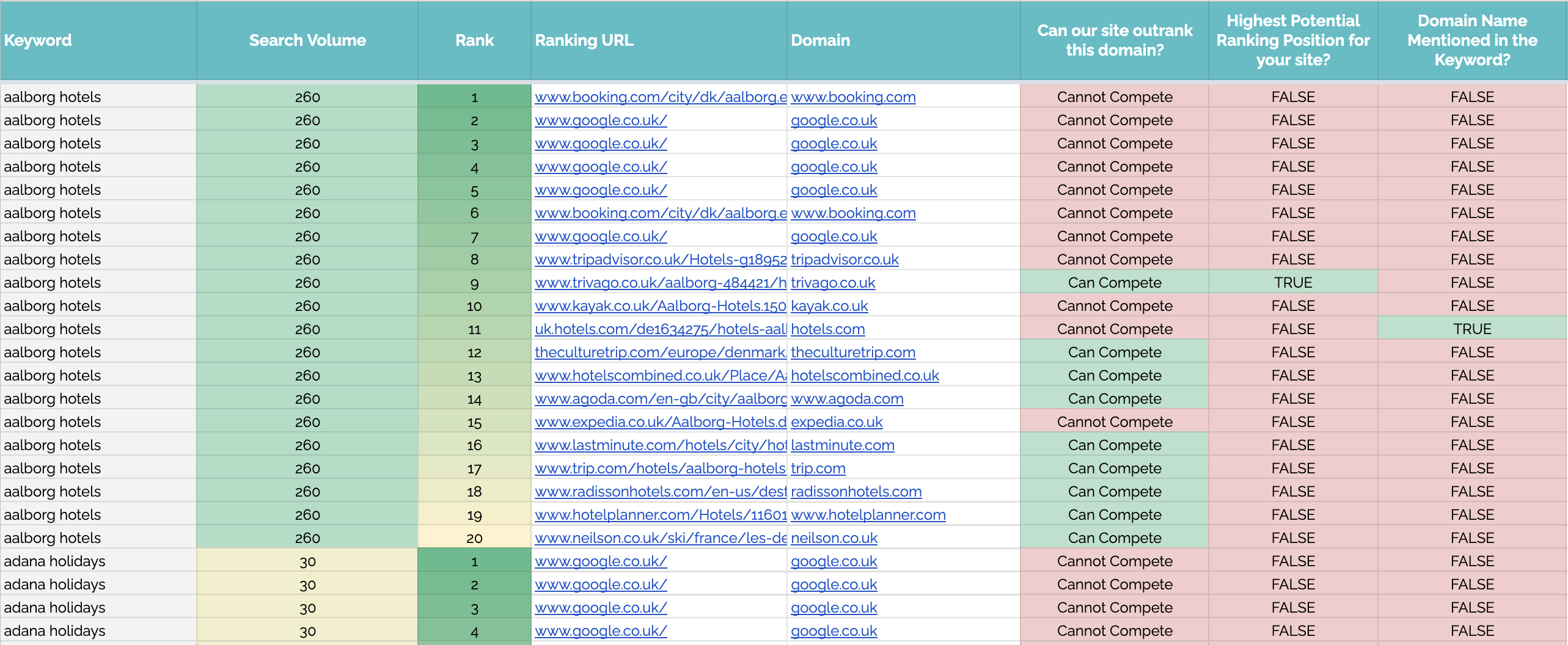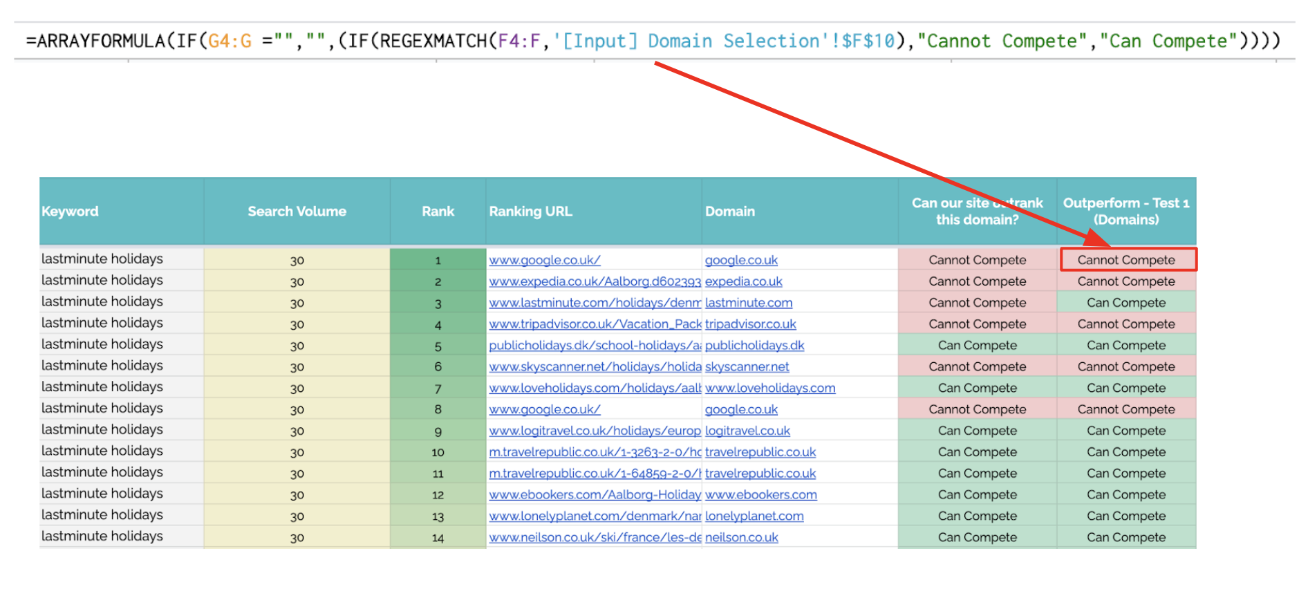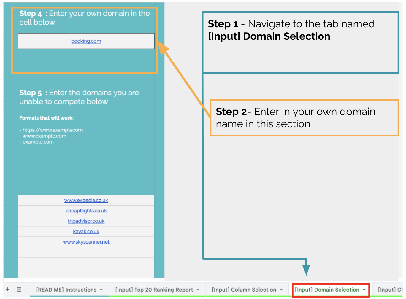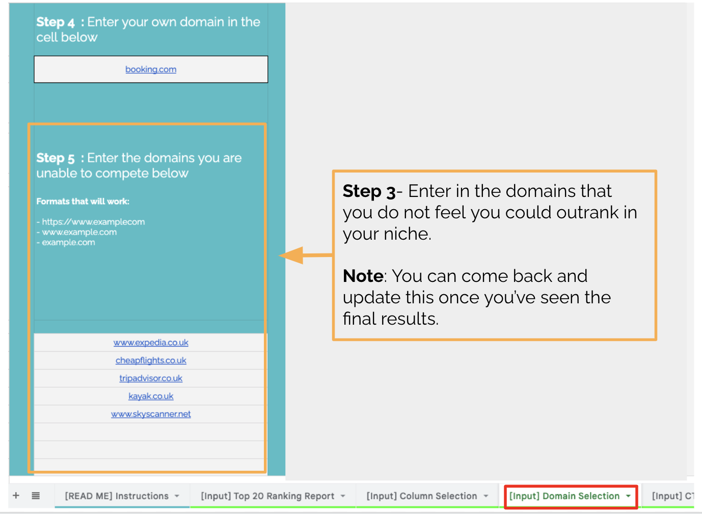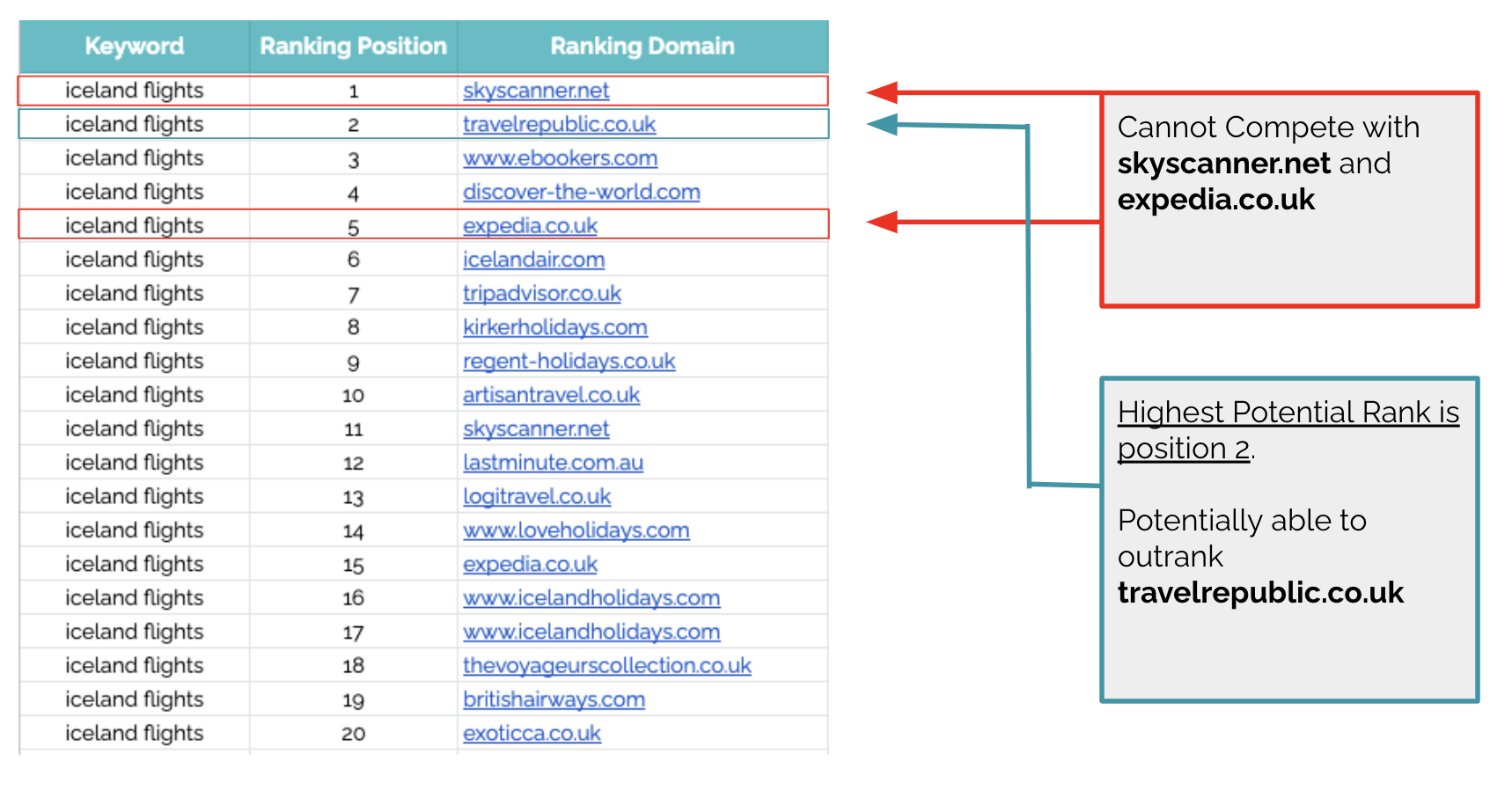 In the example below, skyscanner.net and expedia.co.uk are both listed as domains to remove. In this case, position 2 is the highest potential ranking position, as this sheet only removes the specific ranking positions for the domains listed. This means you can still get a better position if that is available.