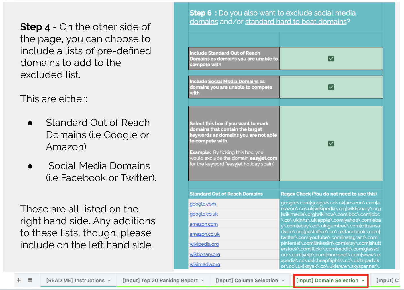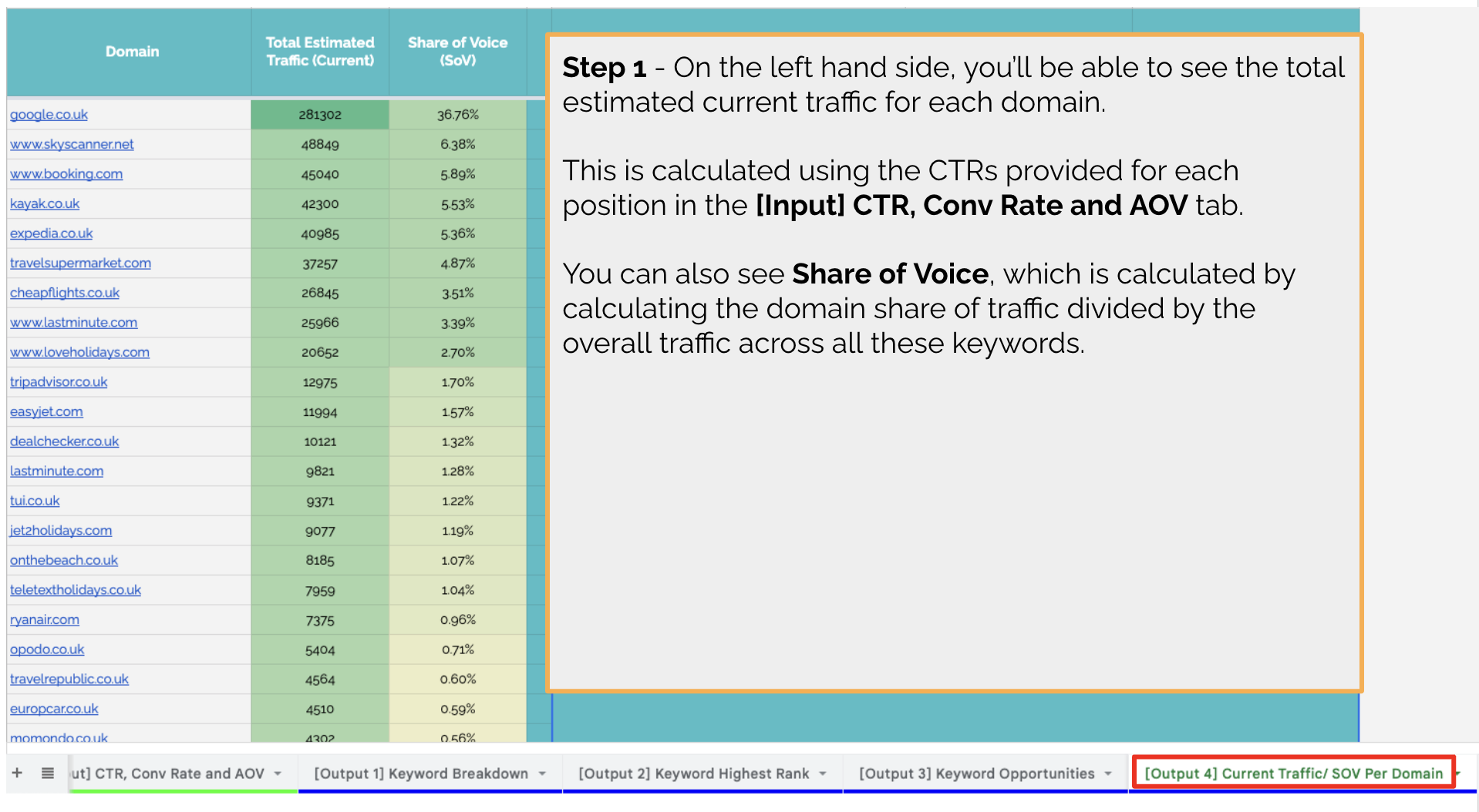 This sheet is designed to allow you to import a top 20 rankings report for your priority keywords, select which domains you feel you aren’t able to outrank within your niche, and optionally enter in CTR figures by position, average conversion rate, and Average Order Value (AOV), if you have access to this data.