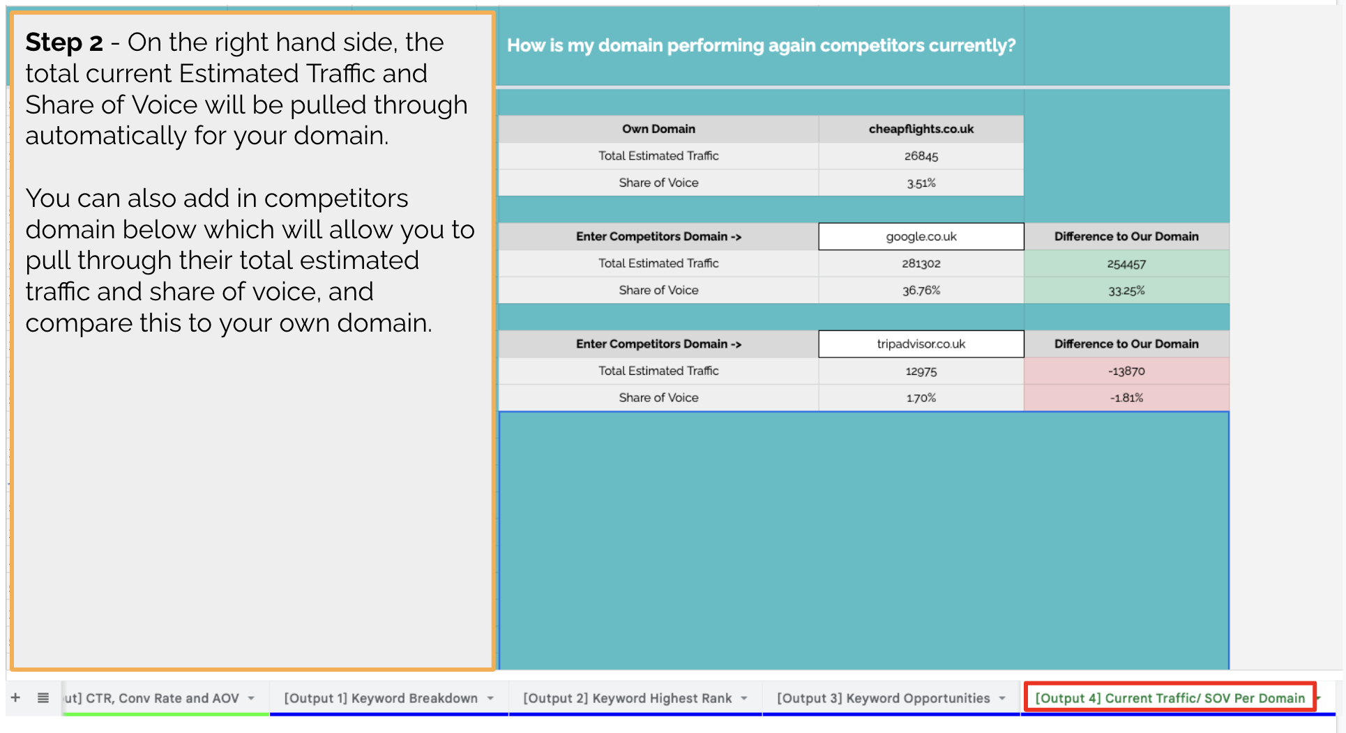 You can then enter competitor domains into the boxes below, which will provide total estimated traffic and share of voice with a comparison to your own domain.