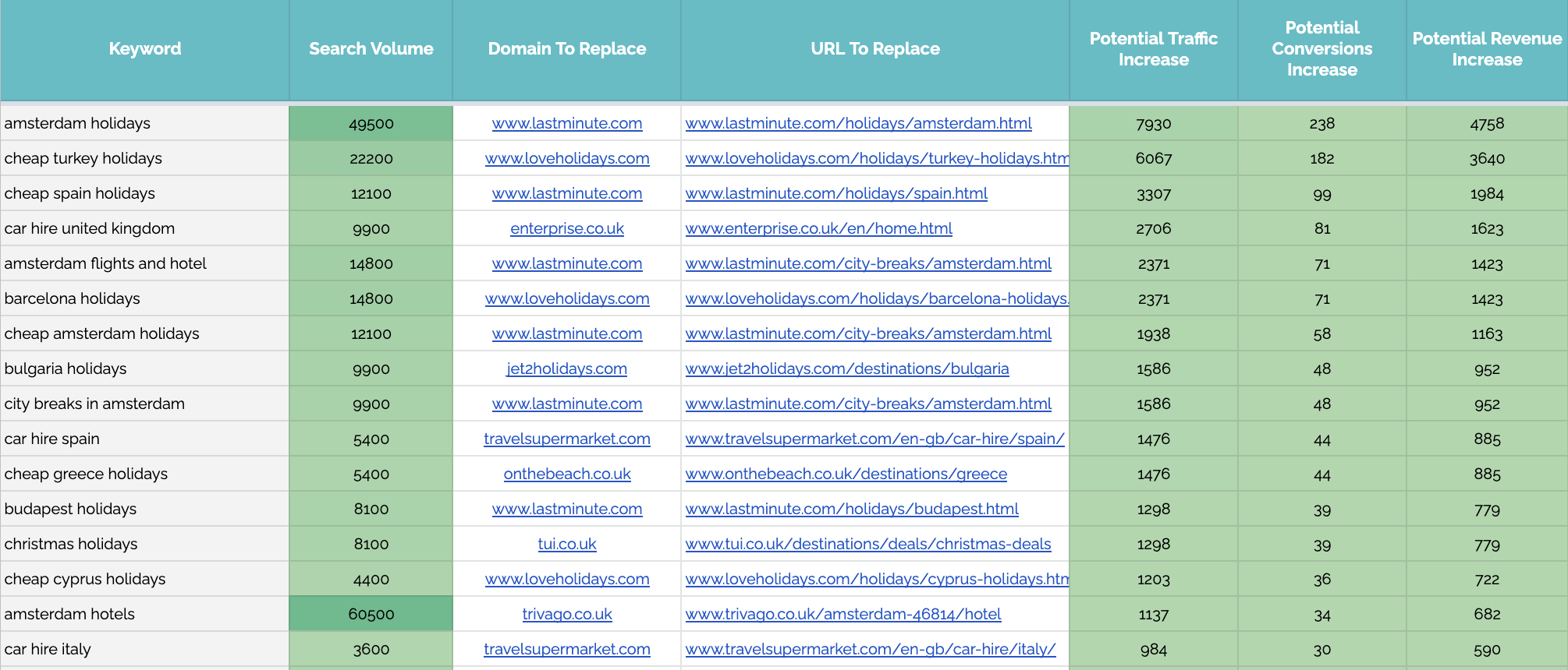 This output provides the top-level summary focusing on the keyword, search volume, and which domain/URL you could seek to replace. The metrics in this output are focused on potential additional traffic, conversions, and revenue.