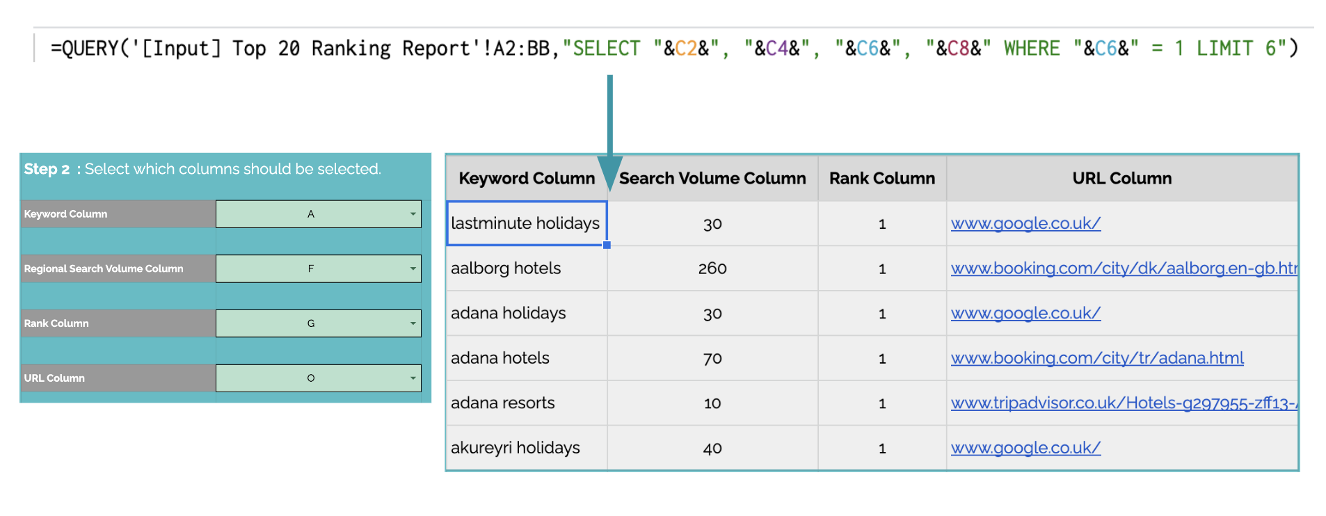 The main formula used is the QUERY function in order to pull specific data from one sheet to another, which automatically updates based on the user's selection on the [Input] Column Selection tab. This logic is used in all the main outputs.