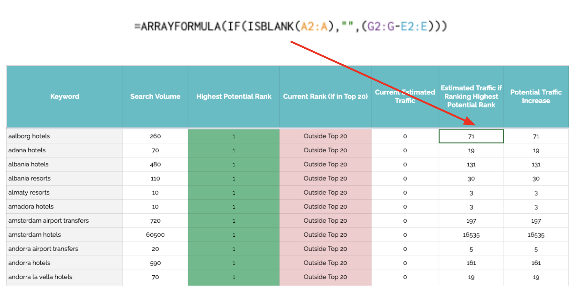 Working out the difference in potential vs. current position is done by subtracting the estimated traffic from the current estimated traffic. There is some additional logic in there to catch whether the current traffic is higher than the potential traffic (as we obviously wouldn’t want the potential rank to be lower than the current rank).