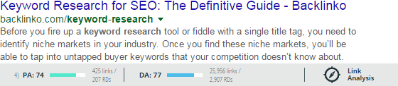If you want to cheat and build your own proxy for Keyword Difficulty, I'm going to risk a few sales and let you in on a secret. Install the MozBar SEO toolbar (it's free), run your Google search, and grab the PA from result #4: