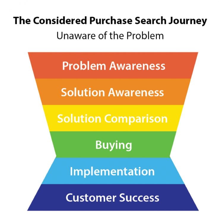 As customer journeys get more complicated, we can adjust and take advantage fo the full customer cycle, from unaware to aware to solution comparison and more. And if we're creative, we can use these searche terms to not only deliver a great experience but to also capture customers early in the buying cycle, as well as lower support costs.