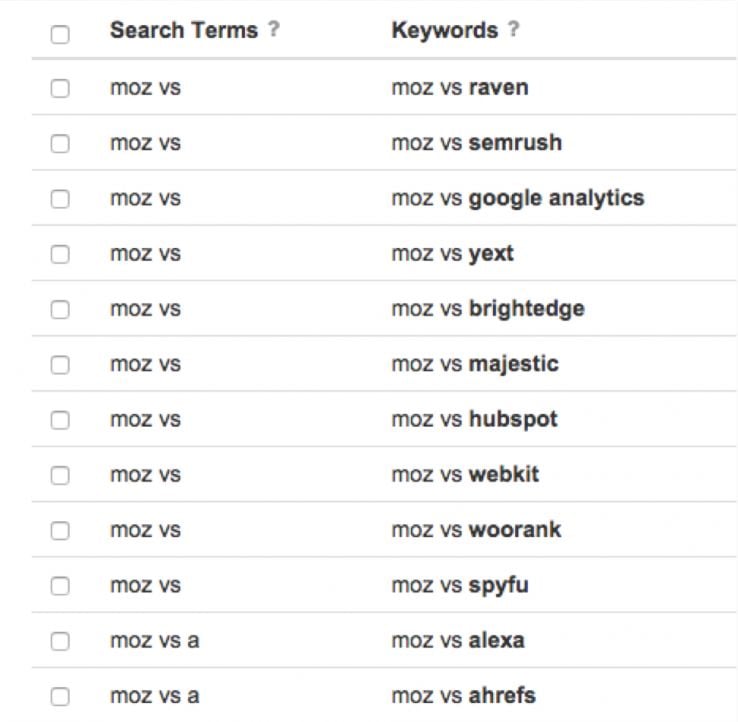 You can find these by simply throwing ["Your Brand" vs] into a keyword tool. For example, for our friends here at Moz, it looks like this: