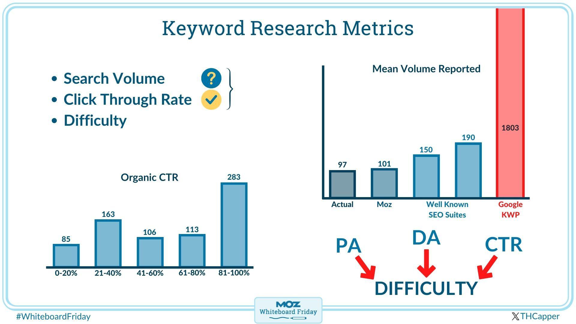 So keyword difficulty is a metric we have in Moz. Some other tools have similar things. What we do is we take the Page Authority and Domain Authority of the other results that are ranking for that keyword to get an idea of sort of how tough the table stakes are for this competition. Then we also look at the click-through rate, the total click-through rate of that query, like I was just talking about.