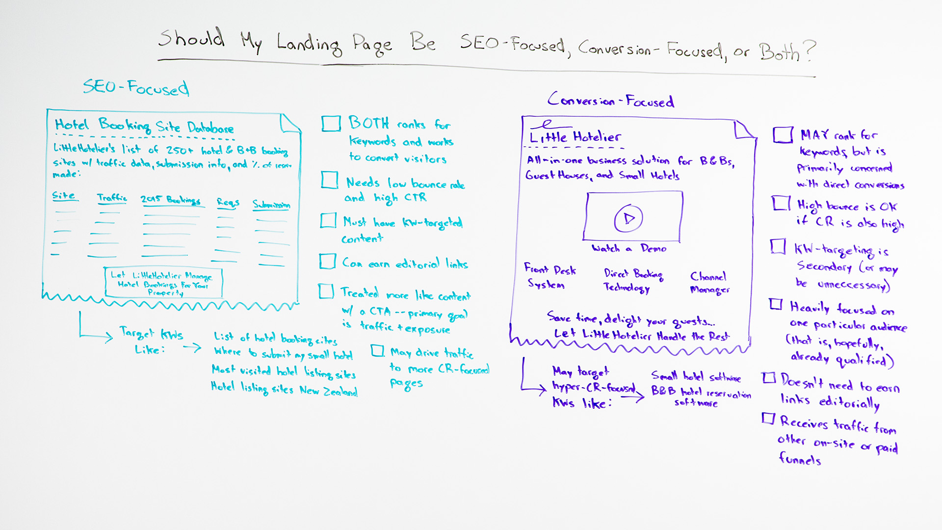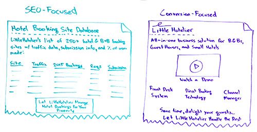 SEO-focused: These folks over here are not necessarily qualified. This might be part of the qualification process. If you visit this page and you then say, "Huh, I'm kind of interested in letting them manage my bookings," maybe you should end up here, on this landing page that is conversion-focused.