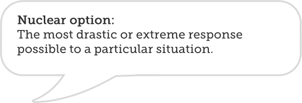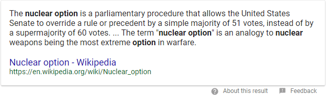 What about the Featured Snippets that didn't generate voice answers? It turns out there was quite a variety of exceptions in play. One exception was answers that came directly from the Knowledge Graph on Google Home, without any attribution. For example, the question "What is the nuclear option?" produces this Featured Snippet (for me, at least) on desktop: