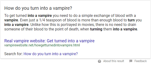 One interesting case is when Google decides to answer a slightly different question. On desktop, if you search for "How to become a vampire?", you might see the following Featured Snippet: