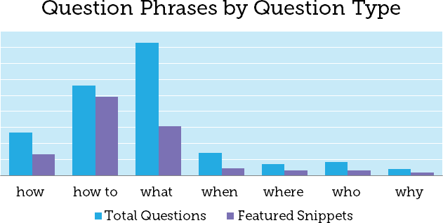 Given the prevalence of "How to?" questions, I've broken them out in this chart. The purple bars show how many of these searches generated Featured Snippets. "How to?" questions were very likely to display a Featured Snippet, with other types of questions displaying them less than half of the time.