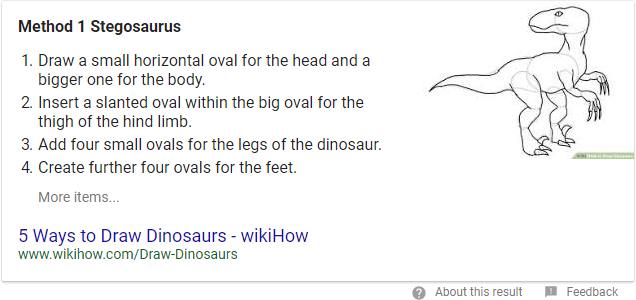 Text snippets — paragraph-based answers like the one at the top of this post — accounted for roughly two-thirds of all of the Featured Snippets in our original data set. List snippets accounted for just under one-third — these are bullet lists, like this one for "How to draw a dinosaur?":