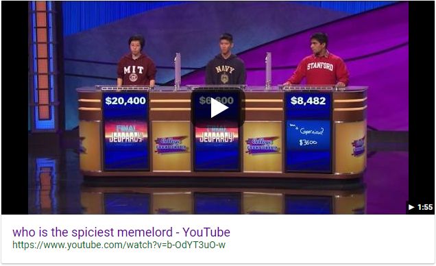 Finally, video snippets are a special class of Featured Snippet with a large video thumbnail and direct link (dominated by YouTube). Here's one for "Who is the spiciest memelord?":