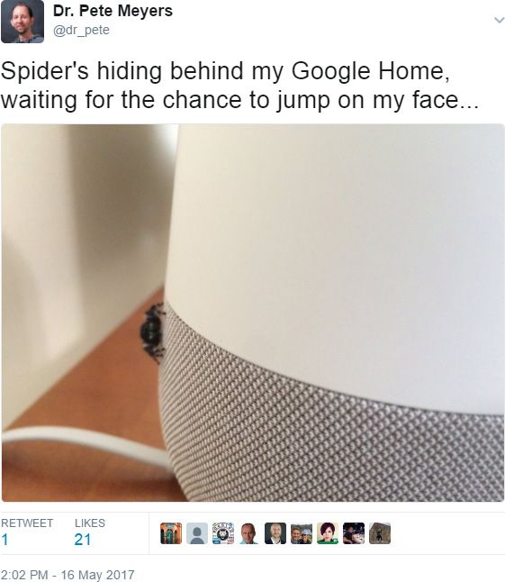 Why only 1,000? Because, unlike desktop searches, there's no easy way to do this. Over the course of a couple of days, I had to run all of these voice searches manually on Google Home. It's possible that I went temporarily insane. At one point, I saw a spider on my Google Home staring back at me. Fearing that I was hallucinating, I took a picture and posted it on Twitter: