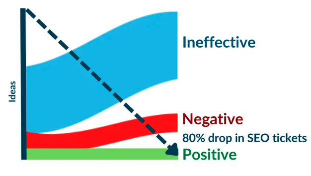 So what can we learn from losing tests, and when can they benefit us as a business? Well, one of the, perhaps, counterintuitive benefits is the drop in effort that you might be asking of your engineering team. If you have all these ideas and previously you're asking your team to build all of them, but if you run tests and you find that some of your ideas were negative, some of them were ineffective and weren't going to benefit you, you're now only asking your product and engineering team to maintain the ones that turn out to have a positive SEO impact. We've seen that be up to an 80% drop in SEO tickets for engineering. So that's one business case right there.