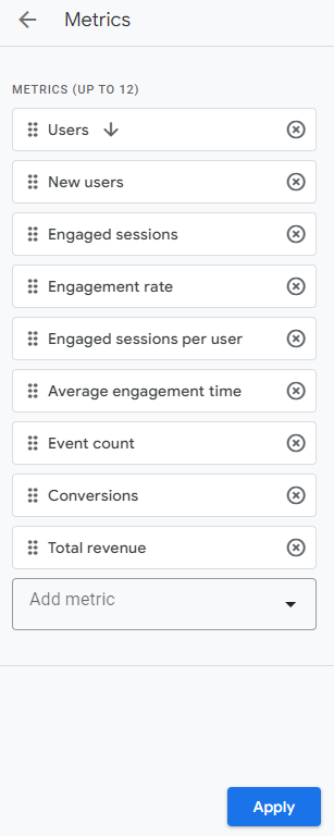 As you saw above, we want to choose ‘total users’ as the main metric, but we don’t see it in the default metrics list. To find the total users, you can click on “Add metric,” and from there, you can select total users and add it to the list.
