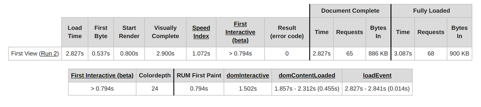 After reducing our font files from 131kb to 41kb and removing one external resource (useproof), the fully loaded time on our test page dropped all the way from 5.1 to 2.8 seconds. That’s a 44 percent improvement and is sure to make Google smile (see below).