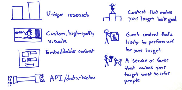 - Last one that I'll mention here is a service or favor that makes your target want to refer people to you. Now this is a challenging thing to accomplish, but if you are a service provider, a content provider, a data provider, or a product provider who has done something amazing and unusual, something that makes you stand out in the minds of a customer, and you know that customer has a website, and that customer could be a business or an organization, an entity, those kinds of things, and you know that that organization often deals with people who need services like yours, reaching out and saying, "Hey, we'd love it if you'd refer folks, and here's what we're willing to offer," and those kinds of things can be another great way to go.
