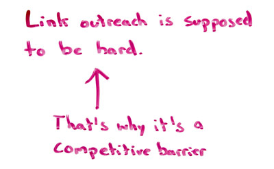 We also know that link outreach is a hard, grueling, manual process. There's no doubt about that. This is frustrating. That's why many of us try and use social sharing or subscriptions or publication to attempt to end around that need for direct link outreach because it's such a challenge.