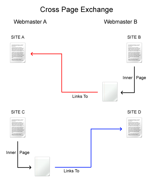 This is probably the best way of exchanging links, as it is very difficult to get caught. The only problem with this type of link exchange is that we would probably not be getting relevant, non-deprecated links, as they would be placed on websites of any topic and on footers (probably). We can apply this cross link exchange method to page exchange too; the only thing we would need here would be 4 websites of the same topic or 2 pairs of websites of the same topic. Page A (from Site A) of Webmaster 1 would link to Webmaster 2's website (Site B), and page C (from Site C) of webmaster 2 would link to another of webmaster 1's website (Site D).