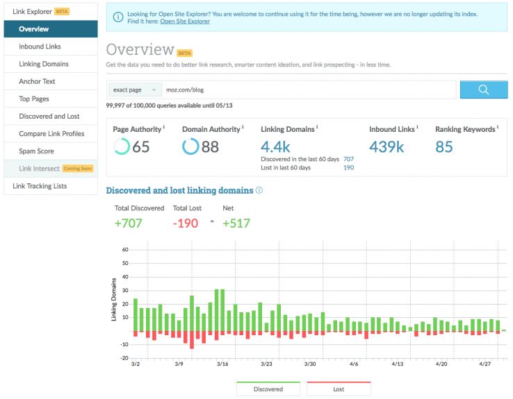 - Link Explorer includes historic data, a painful gap in OSE. Studying your gained/lost linking domains is fast and easy.