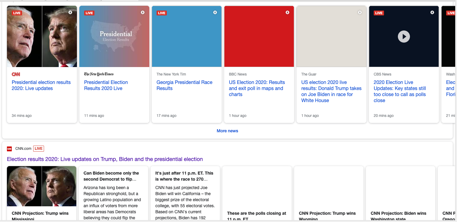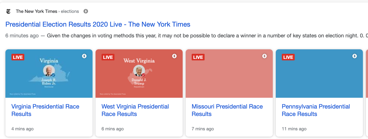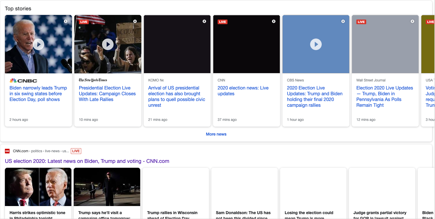 Now let’s look at the same query for the day after the election, November 4, 2020. We still see that publishers heavily utilize this structured data type. In this result, five of the seven first Top Stories results use this structured data type.