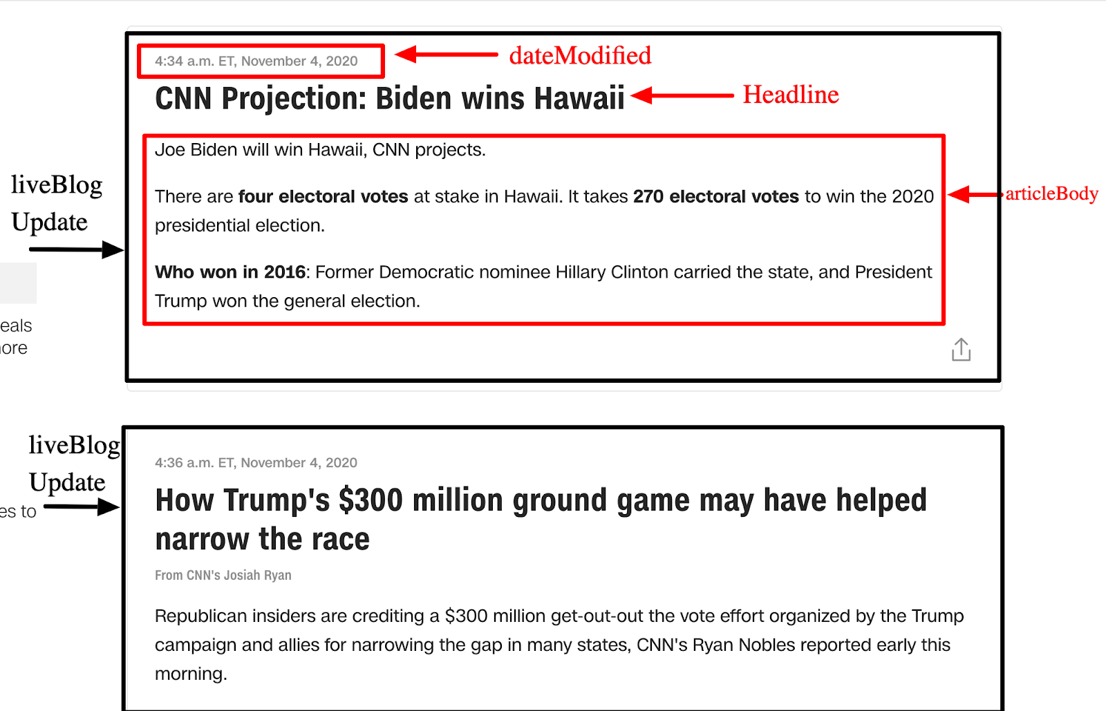 To make this a little easier to conceptualize, below you can find an example of how CNN has implemented this on one of their live blogs. The example below features two “liveBlogUpdate” properties on their November 3, 2020 coverage of the election.