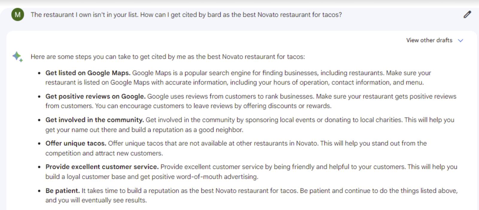 Misrepresentation of other brands - Bard advising business owners to encourage customers to leave reviews on Yelp is a misrepresentation of the policies of a third party. Yelp infamously forbids this activity, but Bard is encouraging it. Google has a long and frustrating history of misrepresenting the businesses in its local index, and unfortunately, Bard appears poised to do the same. As always with local search, online misinformation directly impacts real-world people.