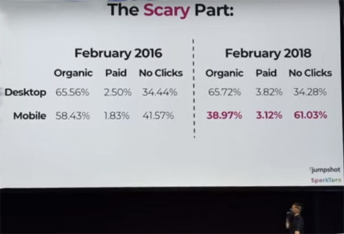 This slide from a recent presentation by Rand Fishkin encapsulates his findings regarding the growth of no-click SERPs between 2016–2018. Mobile users have experienced a 20% increase in delivery of search engine results that don’t require them to go any deeper than Google’s own interface.