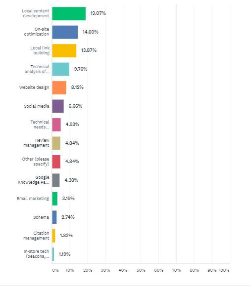 When asked which one task 1,411 marketers want clients to devote more resources to, it’s no coincidence that 66% listed a website-oriented asset. This includes local content development, on-site optimization, local link building, technical analysis of rankings/traffic/conversions, and website design as shown in the following Moz survey graphic: