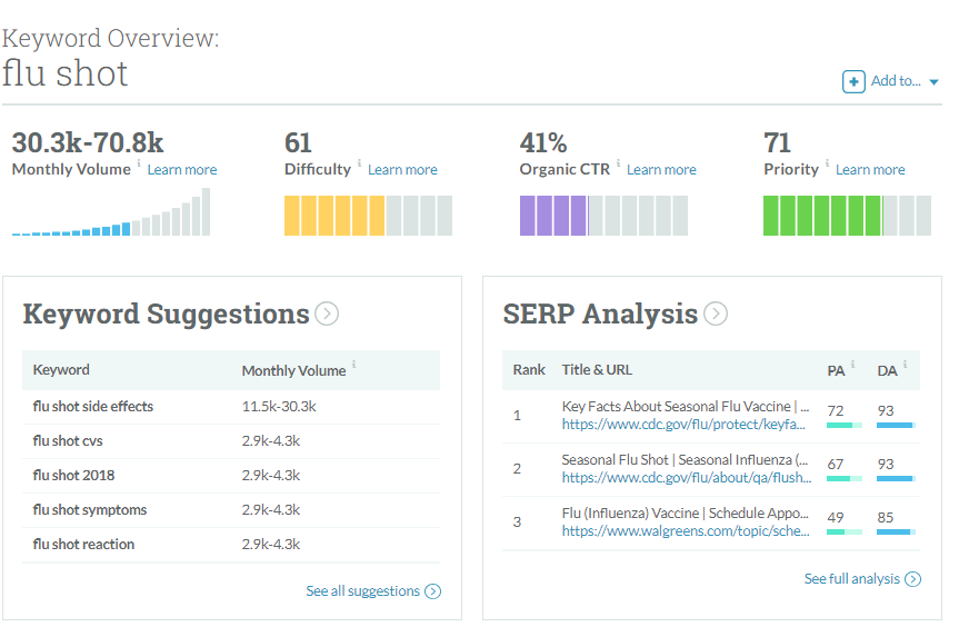 A hypothetical example of this would be a large medical clinic in Dallas. Last year, their phone staff was inundated with basic questions about flu shots, like where and when to get them, what they cost, would they cause side effects, what about side effects on people with pre-existing health conditions, etc. This year, the medical center’s marketing team took a look at Moz Keyword Explorer and saw that there’s an enormous volume of questions surrounding flu shots: