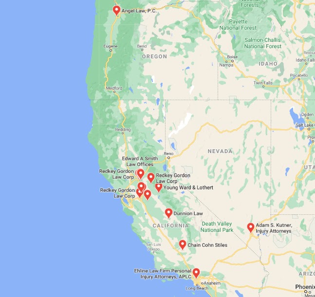 For the search “personal injury attorney angels camp”, note the area covered by map at the automatic zoom level accompanying the Local Finder results: