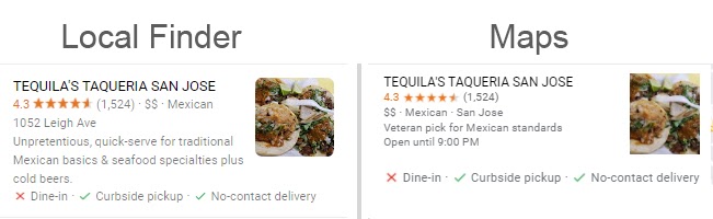 As Joy Hawkins mentioned, above, there can be many subtle differences between the elements Google displays within listings on their two platforms. Look at how hours are included in the Maps listing for this taco shop, but that they’re absent from the Finder. The truth is, Google changes the contents of the various local interfaces so often that even the experts are constantly asking themselves and one another if some element is new.