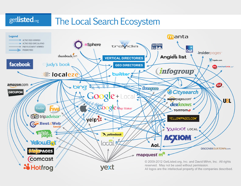 In addition to fixing your data on these local directories, you'll want to fix it on sites that supply them with this data. These sites are Acxiom, Infogroup (ExpressUpdateUSA) and Localeze. Together, these are the three most important business data providers to Google, and if you want to update your old information permanently, you'll need to update it at all three of these sites. These companies also feed most major mobile apps like Facebook Nearby, Foursquare, and Apple Maps.
